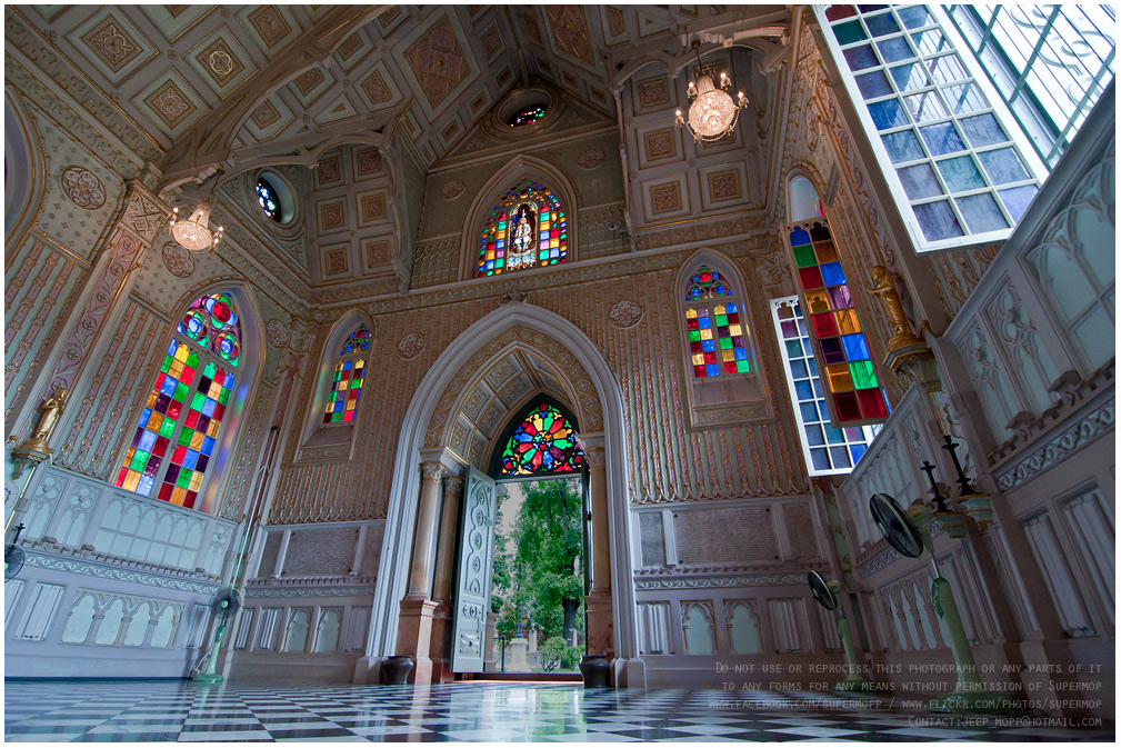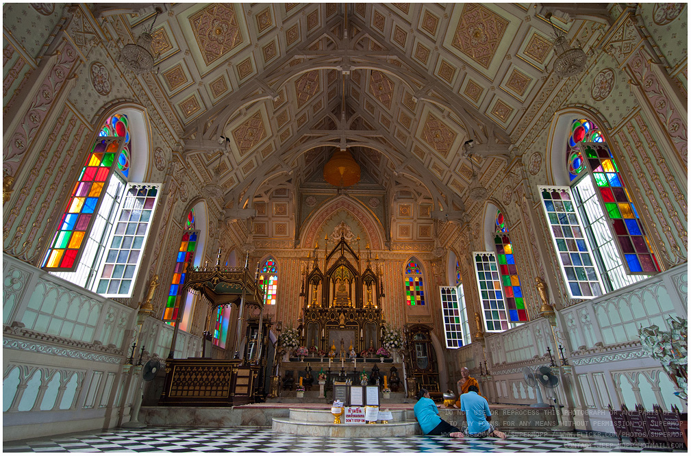 จริง ๆ โบสถ์ไม่กว้างหรอกครับ ภาพที่ได้จากเลนส์มุมกว้างหลอกตาน่ะครับ