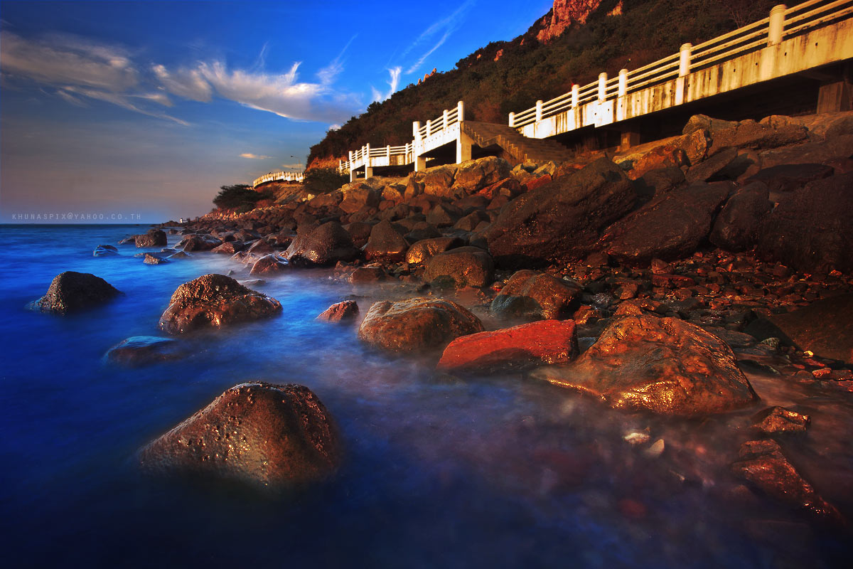 เพลินๆ แป๊บเดียวก็ได้เวลานาทีทองแล้ว... ภาพนี้ถ่ายคร่อม 3 ค่าแสง แล้วเอามาผสานกันด้วย photoshop ตรงนี้หินลื่นมากๆ ไม่อย่างนั้น ผมคงได้ภาพ self portrait ไปเก็บไว้ในคอลเลคชั่นอีกเป็นแน่...อยากไปยืนเหม่อมองพระอาทิตย์ที่ปลายหินมุมบนขวา....