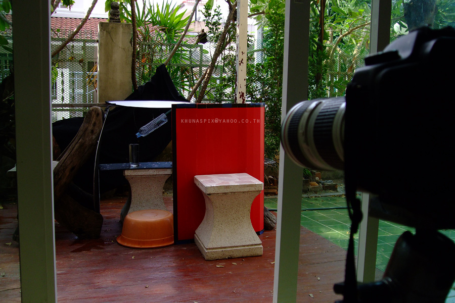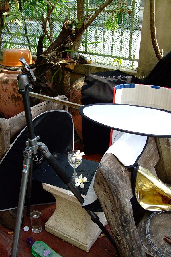 สิ่งที่ยากสำหรับงานประเภทนี้คือผมถ่ายคนเดียวไม่มีผู้ช่วย กล้องก็ไม่มีรีโมต ต้องอาศัยความเชียวชาญในการกะเวลา self timer ให้ดี นับ 10 9 -8 -7 -6....321 แล้วก็เอามือเปิดฝาขวดออกก่อนที่ชัตเตอร์จะลั่น ลองอยู่หลายทีครับ จังหวะไม่สวยสักที จนท้อละครับ...แต่ก็นะ สุดท้ายก็เลือกเอาช็อตนี้ที่ดูพอได้ที่สุด แล้วก็หาเทคนิคใหม่มาเพิ่ม เดี๋ยวดูภาพช่วงท้ายครับ...^^