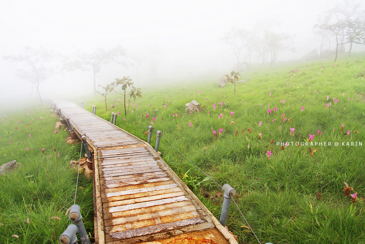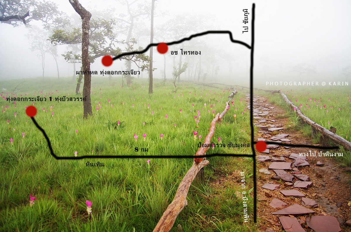 ทางที่ 2 ...ขึ้นทางบ้านซับมงคล ก่อนถึงอุทยาน ทางที่ขึ้นนี้จะอยู่แถวๆทางแยกป้อมตำรวจซับมงคล แยกที่จะไปป่าหินงาม จะเข้าด้านหลังและเป็นทางออฟโรด ทางนี้ถึงทุ่งดอกกระเจียว ทุ่งที่ 1 ทุ่งบัวสวรรค์เลย มีลานกางเต้นท์ ห้องน้ำพร้อม ทุ่งนี้จะใหญ่มากใหญ่กว่าที่อื่น และใหญ่กว่าป่าหินงาน เป็นทุ่งโล่ง ต้นหงิกๆ งอๆ ที่เคยเห็นกันมากมาย ทุ่งนี้จะไม่ค่อยมีครับ ดั่งในภาพเลยครับดูเพิ่มเติม