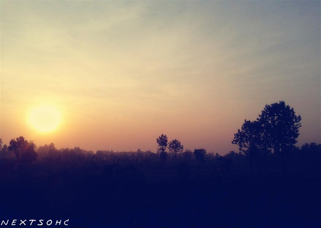 บรรยากาศยามเช้า ช่วงฤดูหนาว มีหมอกอ่อนๆ พระอาทิตกำลังขึ้นอย่างช้าๆ