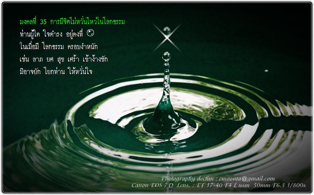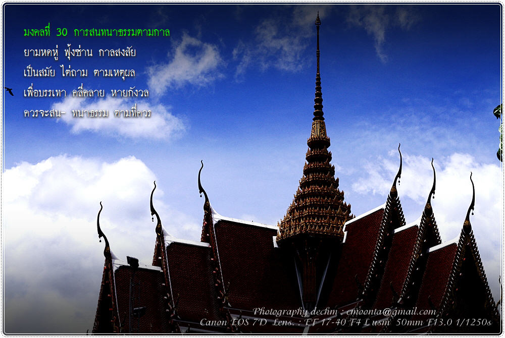 คำคม : คงไม่มีคำคมใดที่มีคุณค่าไปกว่าคำสอนขององค์สมเด็จพระสัมมาสัมพุทธเจ้า ที่มีเทวดามาถามคำถามว่า "คุณธรรมอันใดที่ทำให้ชีวิตประสบความเจริญ" อันเป็นที่มาของ "มงคลชีวิต 38 ประการ" ที่ใครปฏิบัติตามย่อมเป็นเหตุนำมาซึ่งความสุข ความเจริญก้าวหน้าในชีวิต