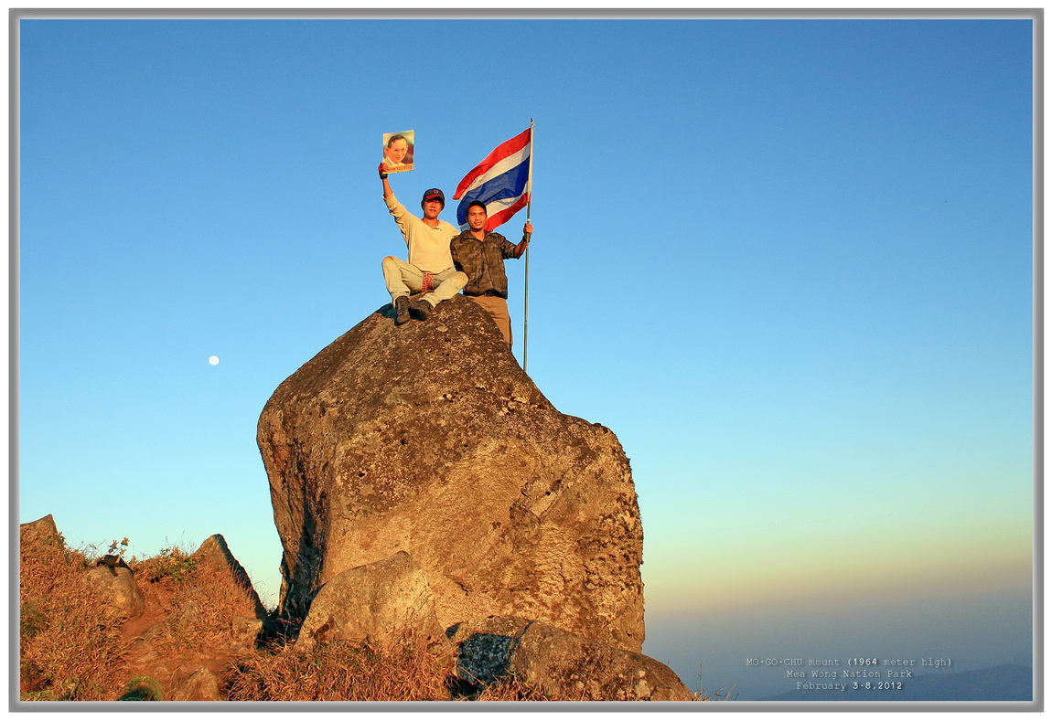 ยอดเขา โมโกจู ยอดดอยที่สูงที่สุดใน อช.แม่วงศ์ จ.กำแพงเพชร สูงจากระดับน้ำทะเล 1946 เมตร (เขาว่าสูงเป็นอันดับ 4 ของประเทศไทย) จากเวลา 5 วัน 4 คืน เดินเท้าไป-กลับ เป็นระยะทางมากกว่า 70 กม. กลับมาถึง กทม. น่องยังบวมต่อไปอีกหลายวัน สุดท้ายสิ่งที่ได้กลับมาคือ อารมณ์ของผู้พิชิต (ซึ่งแลกมาด้วยความเมื่อยล้า) และก็รูปถ่ายกับได้เจ้าก้อนหินเรือใบที่แสงจะโด่งดังนี่แหละ ที่จะเก็บไว้เป็นความทรงจำว่า 'ครั้งนึงตรูเคยยืนอยู่ตรงเนี้ยแหละ'