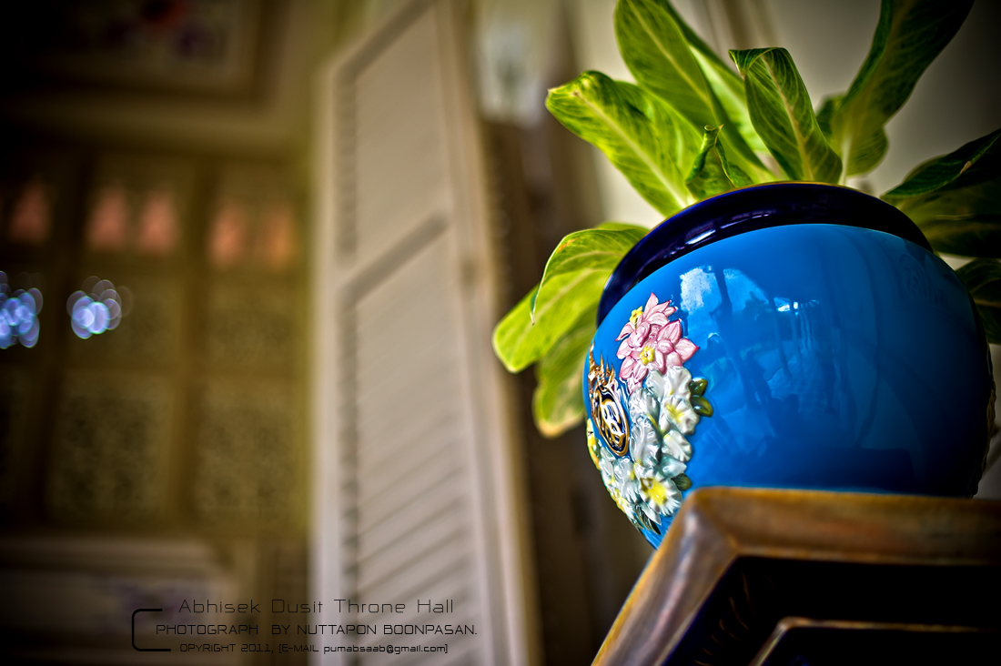 กระถางที่ตั้งหน้าพระที่นั่งอภิเษกดุสิต มีพระปรมาภิไทยย่อ สก.ด้วยเพราะที่นี่เป็นที่จัดแสดงงานของศูนย์ศิลปาชีพ