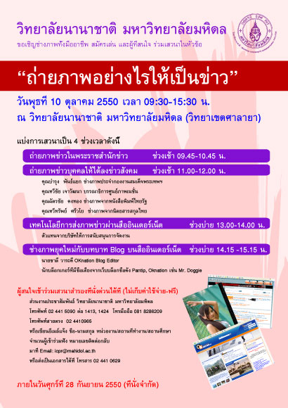- ช่างภาพยุคใหม่กับบทบาท Blog บนสื่ออินเตอร์เน็ต ช่วงบ่าย 14.15 -15.15 น.