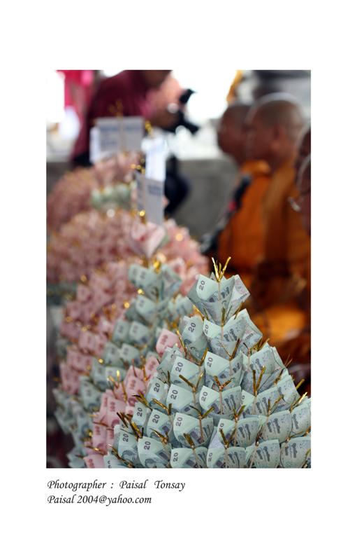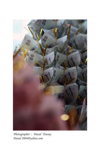 คำตอบที่ 2 อันนี้เป็นปัจจัยสำคัญที่นำมาถวายครับ รู้สึกชอบในความใจเย็นของคนที่ทำครับเองแบงค์มาทำเป็นกลวยแล้วนำไม้ใผ่ผ่าซีกมาหนีบเอาใว้เพิ่มลิบบิ้นลวดมามัดก็สวยอีกแบบ