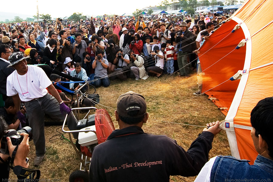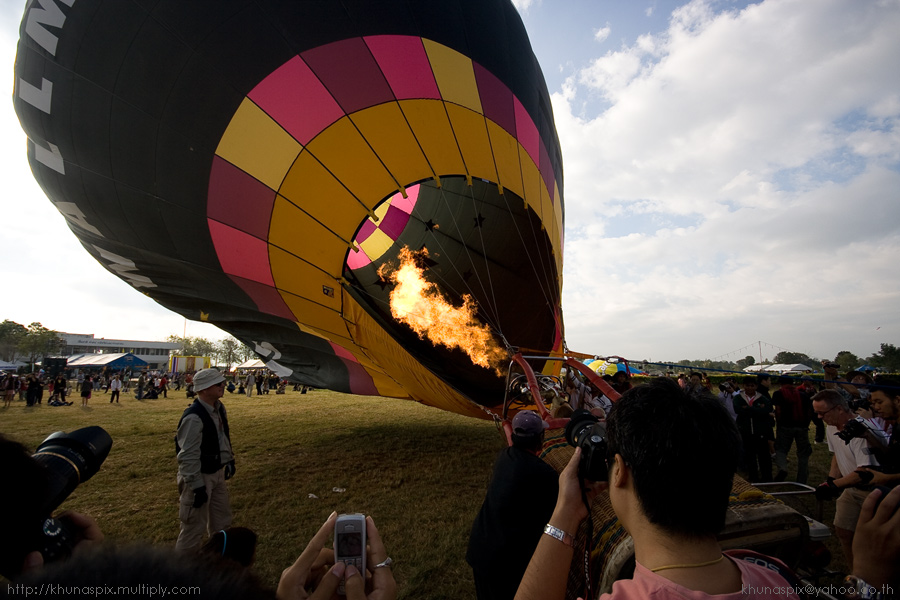 คำตอบที่ 9 ตอนที่เค้าเริ่มเป่าลมเข้าบอลลูนนี่ก็น่าสนุกตื่นเต้นดีจัง...เริ่มจากเริ่มเป่าลมธรรมดาเข้าไปก่อน...เสร็จแล้วก็พ่นไฟร้อนๆ วูบๆ วาบๆ ตามเข้าไป....เสียงดังฟู่ดๆๆ...บวกกับไอร้อนๆ น่าตื่นเต้นดีจัง...ดูตากล้องสิครับ......ภาพนี้ผมชูกล้องขึ้นเหนือหัวกดชัตเตอร์ลงครึ่งหนึ่งเพื่อล็อคแสงและโฟกัสไว้...เสร็จแล้วก็ปรับระนาบของกล้องไม่ให้เอียงซ้าย ขวา ก็ได้มาประมาณนี้ รู้เลยว่ากล้องแพงๆ ที่มีไลฟ์วิวิมันดีกว่าอย่างไร........