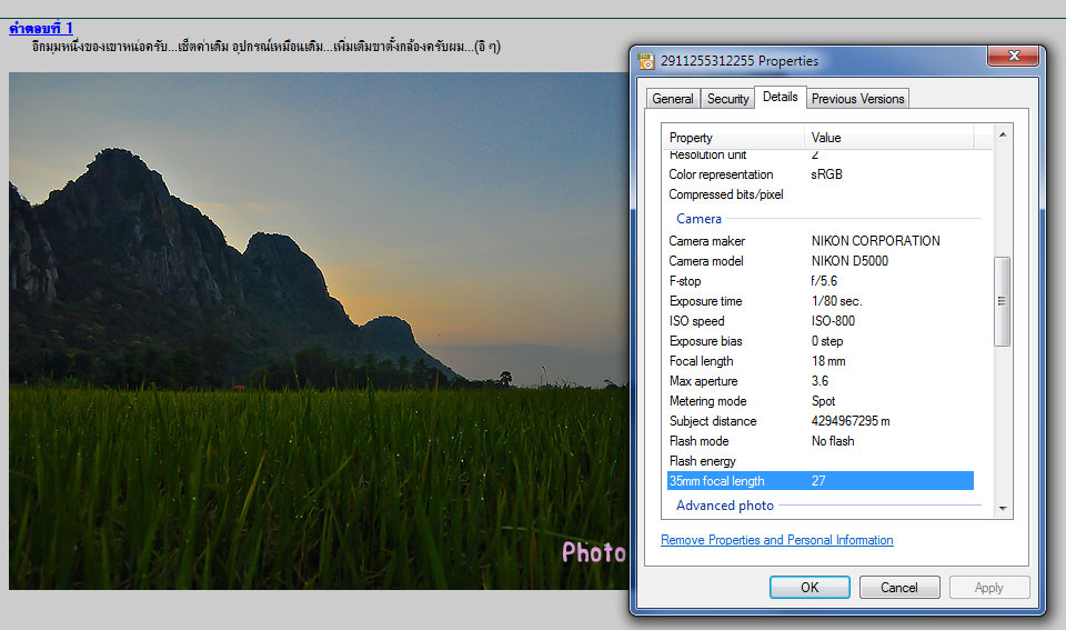 ลุงปู่ครับ โปรแกรมข้างต้นที่แสดงรายละเอียดเกี่ยวกับการถ่ายรูป คือโปรแกรมอะไรอ่ะครับ..บางครั้งผมถ่ายรูปไปแล้ว ถ้าไม่จดรายละเอียดเอาไว้ ลืมหมดเลยครับ ต้องมานั่งนึก ๆ กันอีกรอบว่าจำอะไรได้บ้าง ผมลองหาโปรแกรมดูแล้วแต่ไม่เจออ่ะครับ ผมจะเอาไว้ดูเพื่อเอาไปปรับปรุง และเปรียบเทียบระหว่างภาพเก่า ภาพใหม่ อ่ะครับ...