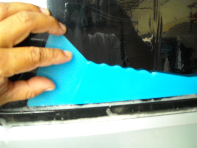 จากนั้นก็เริ่มไล่ฟองอากาศ โดยใช้ บัตรพลาสติกหรือไม้บรรทัดก็ได้ครับ โดยนำเอา พลาสติกที่ลอกออกมาทับฟิมล์ที่ติดก่อน เวลารีด จะได้ไม่เป็นลอยที่ฟิมล์ ครับ