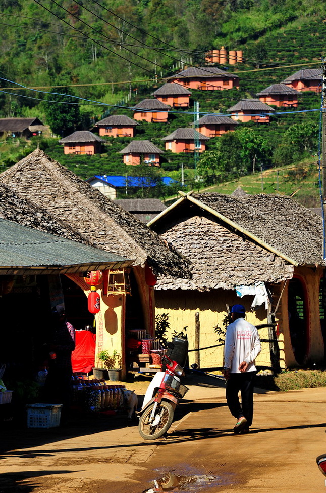 ขับรถเข้าไปในหมู่บ้านด้านในกันครับ จะเห็นร้านชาเยอะครับ ด้านหลังบนเนินเขา(ลิบๆ)คือที่เราพักเมื่อคืนนี้ครับ