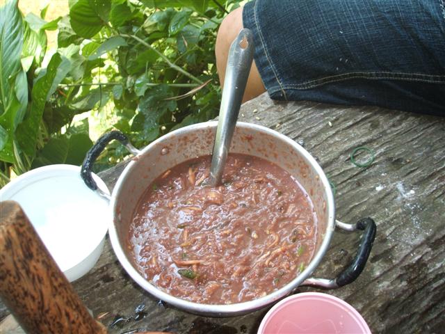 ตอนเย็นลุงพันชวนไปจับกบภูเขา พวกเราก็คิดว่าหมู ๆ คงไม่ไกลจากที่พักเท่าไหร่ เลยตกลงไปกัน เห็นลุงพันอายุ 70 กว่าแล้วคิดว่าคงไปไม่ไกลซักเท่าไหร่ ทุกคนแต่งตัวพร้อมออกภาคสนามกัน ตอนแรกก็เดินไปพร้อม ๆ กัน ซักพักลุงพัน เดินหายไป ทุกอย่างมืด จนแทบมองไม่เห็นแม้แต่เพื่อนร่วมทาง ลุงพันหายไปในความมืด พวกเราเดินตามไม่ทัน ล้มลุกคลุกคลานอยู่กับป่าและสายน้ำ เขียวช้ำไปทั้งตัว ตามลุงพันไปเท่าไหร่ก็ไม่ทัน เลยนั่งรอในความมืด นานมาก ๆ ลุงพันก็ยังไม่ลงมา เพิ่งได้ข่าวว่าชาวบ้านสู้กับหมีป่าในหนังสือพิมพ์เมื่ออาทิตย์ที่แล้วยิ่งกลัวกันใหญ่ ตัดสินใจกันว่าจะไม่ตามลุงพันไปแล้ว เลยคลำทางกลับที่พักกัน กว่าจะหาทางกลับกันได้ ต้องใช้มือคลำทางกัน ใช้สัญชาตญานจากรอยทางเดิม ๆ ทั้งมือทั้งเท้า คลำทางกัน จนไปผ่านทางชาวบ้านหรือป่าวก้อไม่รู้ แต่โดนขู่ด้วยเสียงคำราม แต่พวกเราใช้ความจริงใจตอบไปด้วยความเป็นมิตร เลยผ่านไปได้ ค่อย ๆ คลำทางจากรอยทางเดิม ๆ จนมาถึงที่พัก อีกซักชั่วโมงลุงพันกลับลงมาพร้อมทั้งกบ เขียด หรือปาดก็ไม่รู้มาโชว์ เราถามลุงพันว่ารู้ได้ยังไงว่าเราลงมาแล้ว ลุงพันแกบอกว่ากูเห็นทางเดินเปียกแฉะไปหมด ต้นหญ้าเรียบเป็นทางเลย ก็จะไม่ให้เห็นรอยได้ยังไง ขากลับทุกคนทั้งล้มทั้งคลาน กว่าจะถึงที่พักได้ตอนเกือบตี 2