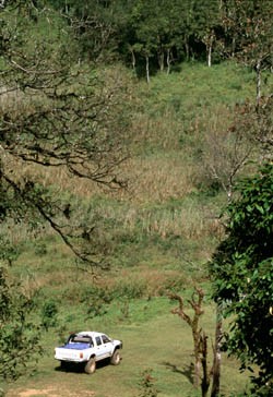 คำตอบที่ 11 กระทิงโทนจอดสงบนิ่งอยู่ที่ลานจุดชมวิวด้านดอยช้าง มองจากทางเดินขึ้นนมัสการพระธาตุ