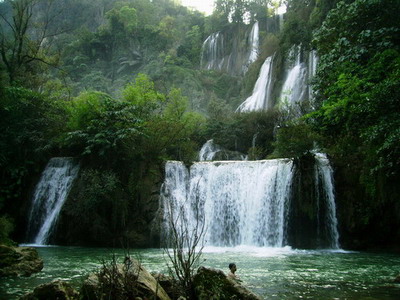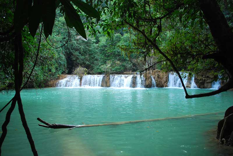 คำตอบที่ 2 ธารน้ำสีเขียวมรกตข้างทางเดินก่อนถึงน้ำตก