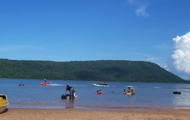 หาดจอมทองอยู่ในบริเวณพื้นที่ท้ายเขื่อนลำมูลบน ใกล้กับเขาจอมทอง ตำบลจระเข้หิน มีความกว้างของหาดจากแนวริมน้ำขึ้นมาเฉลี่ย 80 เมตร ยาว 800 เมตร