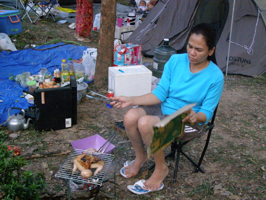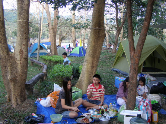 ส่วนภาพนี้หลังจากหาทำเลที่ตั้งกางเต็นท์นอนได้ที่ใต้ร่มไม้ แถบริมน้ำไม่มีครับ และก็เป็นที่โล่ง แดดจัด บรรดาแม่บ้านก็เริ่มทำอาหารกินกันแล้ว