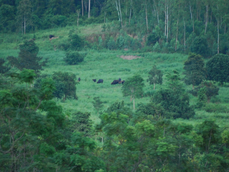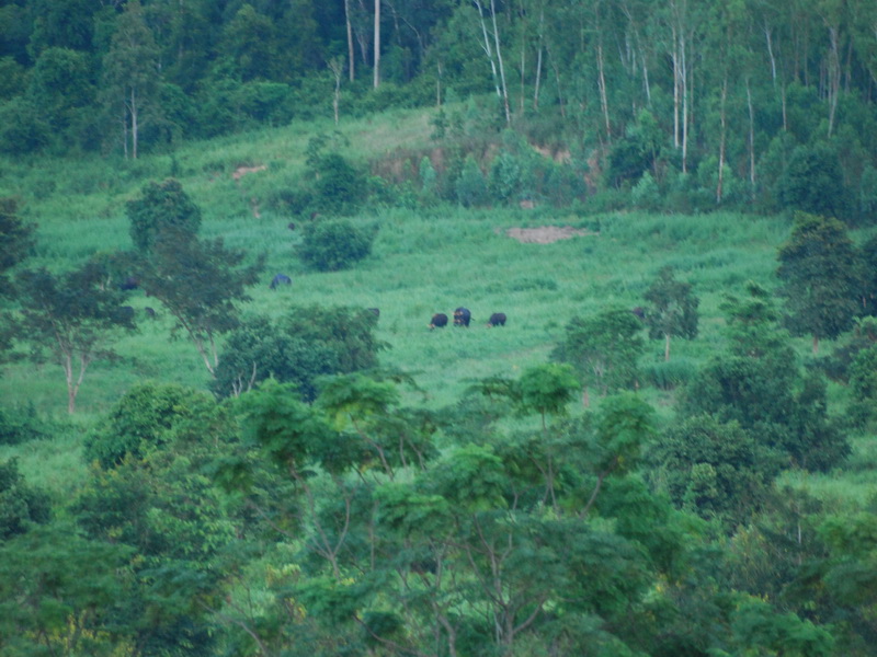 หลังจากซุ่มดูอยู่ประมาณหนึ่งก็เห็นช้างป่าเดินออกมาโชว์ตัวครับ ทำให้มีแววว่ากระทิงจะออกมาให้ดู เนื่องจากตามธรรมชาติช้างป่ากับกระทิงจะหากินอยู่ในบริเวณใกล้เคียงกันครับ แต่เจ้าหน้าที่กำชับว่าต้องเงียบและทิศทางลมเป็นสิ่งสำคัญเนื่องจากกระทิงเป็นสัตว์ที่มีประสาทดมกลิ่นดีมาก หากทางลมพัดจากเราไปหาเขา กระทิงจะหลบไม่ออกมาให้เห็นครับ