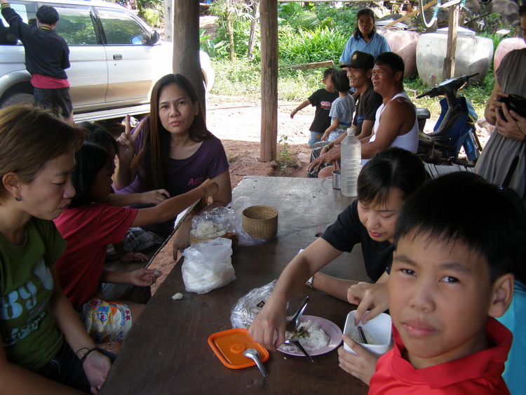 คำตอบที่ 11 จนกระ่ทั่งถึงหมู่บ้าน แวะพักทานข้าว พวกเด็กๆ ก้อนั่งกินข้าวเหนียวหมูฝอยกัน ชาวบ้านที่นี่มีอัธยาศัยดีมากๆ ต้อนรับเป็นอย่างดี