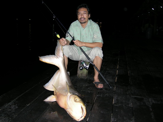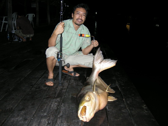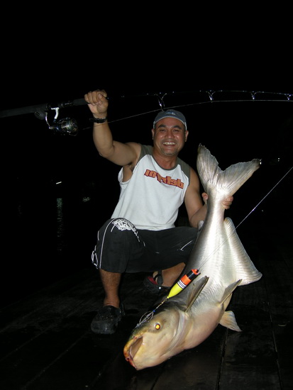 หลังจากนั่งแห้วอยู่ทั้งคืนน้าใหญ่ก็ได้อัดปลากับเขาบ้างเมื่อเสียงขวดล้มดังขึ้น น้าใหญ่ได้จังหวะปลอดเจ้าของคันรีบกระโดดคว้าขึ้นมาอัดทันที เพียงชั่วข้าวสุกน้าใหญ่ก็อัดเจ้าบึกตัวเขื่องขึ้นมาเป็นบำเหน็จมือจนได้ แม้มันจะใช้หางกินเบ็ดก็ตาม