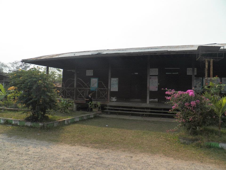 อาคารไม้ชั้นเดียวเป็นห้องพักครู ห้องสมุด ห้องเรียนชั้น ป.1