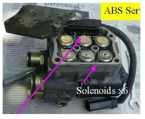 ภาพเจ้า abs module ที่เปลื้องผ้าออกแล้ว เห็น solenoid ภายในก็วัดและ test ได้ง่ายๆๆ ทำเองได้เรย... ป้อนไฟเข้าไปเด้อ ถ้าดุ๊กดิ๊กๆๆ ได้ก็โอเรย....
