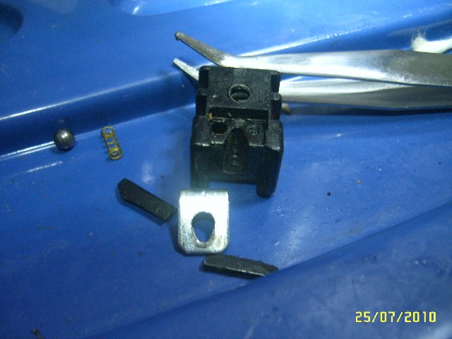 พอแยกออกมาก็เจอตัวปัญหา คือตัวประคองแผ่นล็อคแตกครับ สปริงตัวดันคอนแท็คก็ทรุด