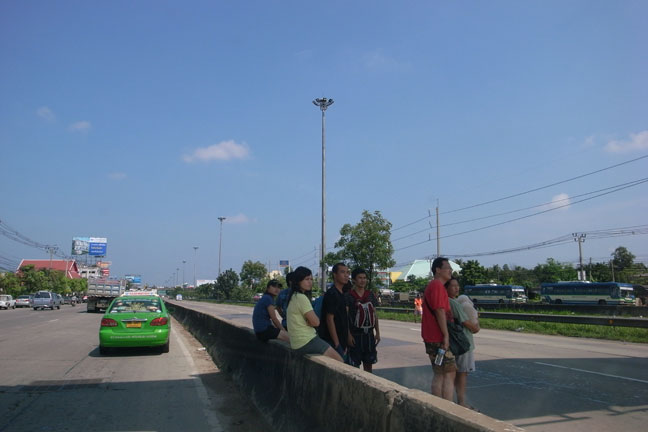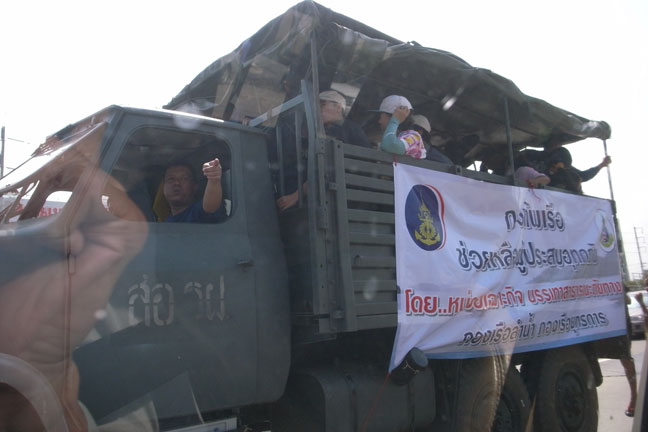 ชาวบ้านยังอพยพต่อเนื่อง หลายๆ คน ต้องโบกรถเพื่อเดินทางกันแล้ว.. เพราะรถญาติที่มารับบางคันไม่สามารถลุยน้ำเข้าไปได้ หรือไม่ชัวร์จึงจอดแล้วขออาศัยคันอื่นๆ เข้าไป