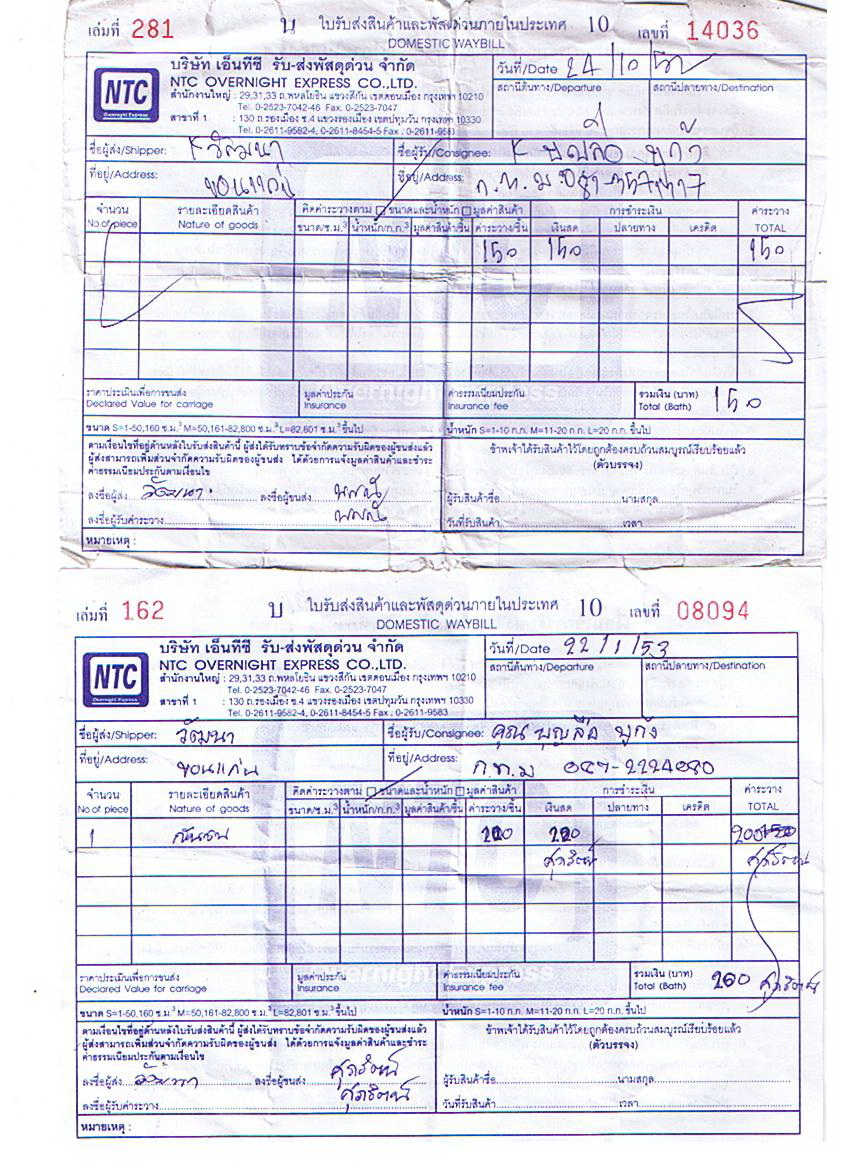 คุณjeepเจ้าแก้วครับ ใบเสร็จมีแต่ใบตอนส่ง2ใบ ส่วนใบรับ2ใบคนที่บ้านรับของแล้วทำหาย น่าจะใช้ใบส่ง2ใบยืนยันได้เพราะถ้าไม่ได้รับ2ครั้งก็ไม่มีกันชนไปส่ง2ครั้งนะครับ หวังว่าคงเข้าใจ