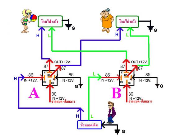 เอา Wiring ไฟหน้า ของน้องมนมาฝากเผื่อเอาไปเป็นแนวทางทำ Relay เพิ่มกระแสให้ไฟหน้า เอ .. หากจำไม่ผิดรถญี่ปุ่นจะเอาไฟบวกมารอกราวด์ แต่ JeeP เอากราวด์มารอไฟบวก รึจะจำผิด ทำ Wiring ระบบนี้ใช้เองเหมือนกัน สายไฟที่ทนกระแสได้สูง ๆ สายจากฟ้าท่าจะดีน่ะหมอกดำ