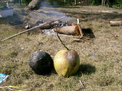 พ่อครัวทำหน้าที่หามะพร้าวให้ลูกบ้านกิน ชื่นจายจริง ๆ