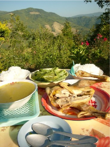 หนอ.สัวย่า จาเยอ แกกําลังต้มไก่ ให้ผม แกปลูกผักปลอดสารพิษดว้ย