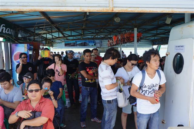 เมื่อเรือเฟอร์รี่ออกจากท่า พวกเราก็ขึ้นมาคอยอยู่ชั้นบนของเรือ เพื่อชมวิวและบรรยากาศรอบๆ มีอยู่แต่น้าชายที่เมาเรือและขี้นไปชั้นบนไม่ได้