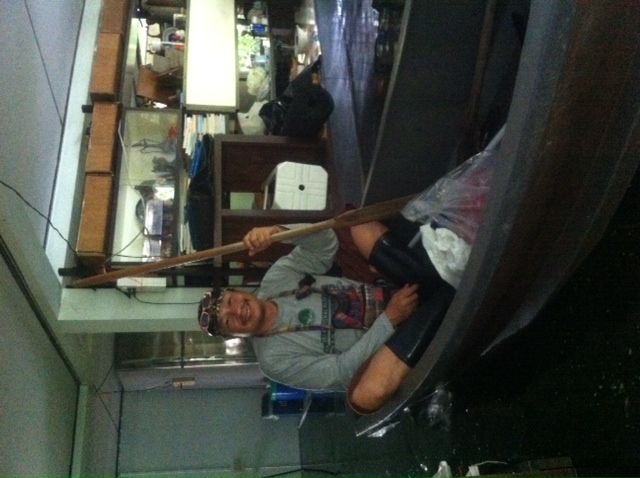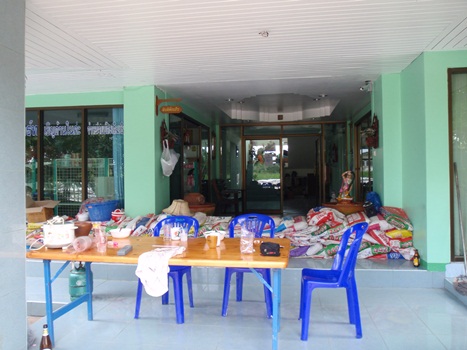 หน้าอพาร์ทเม้นท์ยังแห้งอยู่ แต่ก็เตรียมเก็บสิ่งของลงกล่องพลาสติกขึ้นใว้ที่สูง บางส่วนก็ยกขึ้นไปเก็บใว้ที่ชั้นสองของอพาร์ทเม้นท์แล้ว เรือยางจอดรออยู่ด้านหลัง รถยนต์ขับไปจอดบนสะพานข้ามแยกตลาดปู่โพธิ์ มอไซร์FINOกะPCXยกขึ้นไปใว้ชั้นสองแล้ว