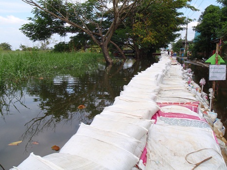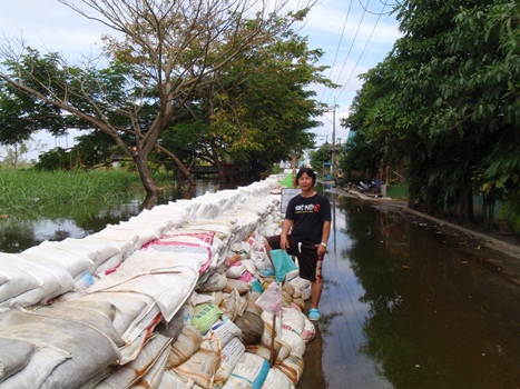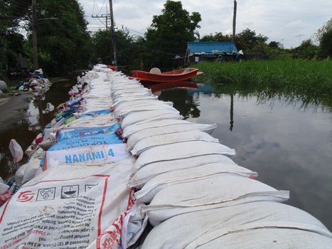 แนวน้ำนอกกระสอบทรายคือแม่น้ำเจ้าพระยา ด้านในคือหน้าอพาร์ทเม้น