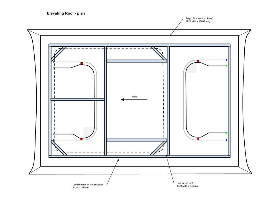 ผังภาพรวม แนวเส้นปะคือแนวหลังคาที่เจาะออกครับ ทำให้ต้องทำสามเหลี่ยมตรงมุมเพื่อทำจุดยึดตอนปิดหลังคา