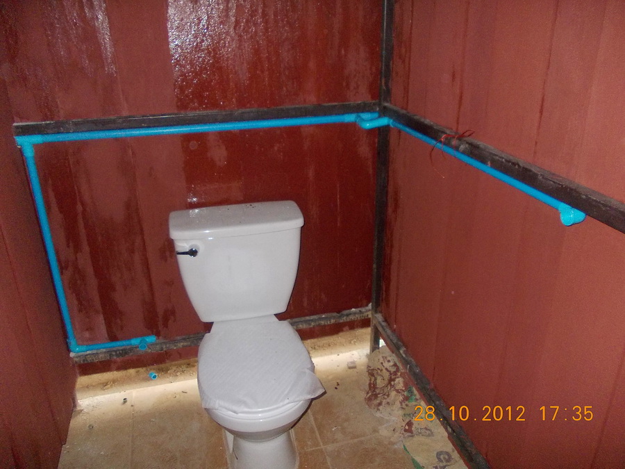 โถแบบมีหม้อน้ำ เตรียมจุดไว้สำหรับฝักบัว สายฉีด และสายอ่อนเข้าหม้อน้ำชักโครก ท่อทั้งหมดยังไม่ได้ทากาวเผื่อต้องการเพิ่มจุดไหนอีกเมื่อสรุปจบแล้วค่อยทากาวและยึดให้แน่นจึงทาสีท่ออีกที