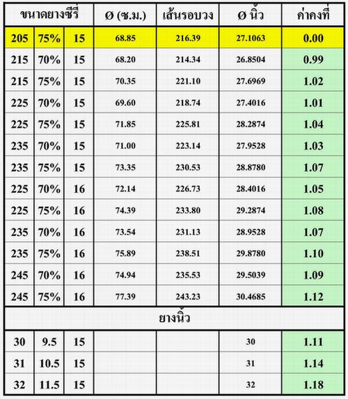 สมาชิกที่เปลี่ยนยางต่างขนาดไปจากเดิม ใช้ยางขนาดไหนก็ดูในแถวนั้นตัวคูณในช่องระบายสีเขียวอ่อน...
