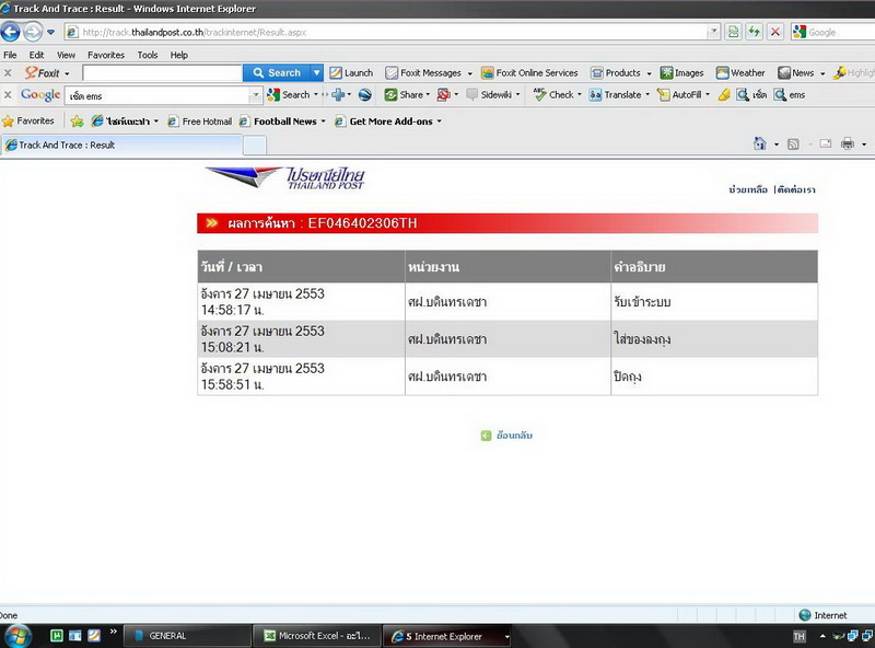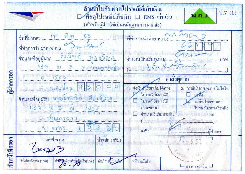ผมส่งของไปแล้วนะครับ จากราชบุรี 12 /06/2010 เวลา 11.46 น ลงทะเบียน TAX ID 3030567253 , 7.96 Kg