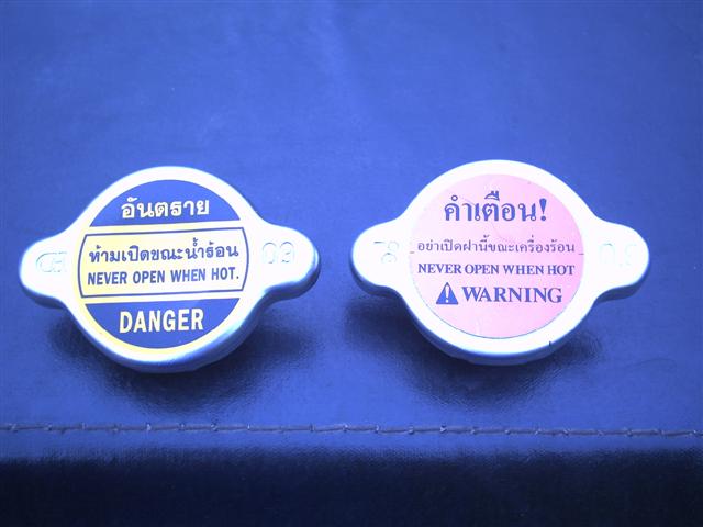 เมื่อ 2 อาทิตย์ที่แล้วได้เดินทางไปจังหวัดขอนแก่นโดยได้ใช้ความเร็วรถในรอบสูงต่อเนื่องเป็นเวลานาน อุณหภูมิที่ปรากฎบน water temp meter บอกค่าวความร้อนประมาณ 100 - 115 องศาเซลเซียสตลอดการเดินทาง เมื่อถึงที่หมายเปิดฝากระโปรงพบว่าน้ำในหม้อพักน้ำหายเกลี้ยง ก็ยังไม่เอะใจเติมน้ำเข้าไปใหม่ เดินทางกลับด้วยความเร็วเท่าเดิม มาถึง ก็อาการเดิมครับ น้ำหายอีกละ แต่คราวนี้ไม่หมดเหลือนิดนึง สอบถามท่านผู้รู้หลาย ๆ ท่านรวมทั้งพี่เหน่งตาลเดี่ยว ก็ได้บทสรุปว่าน่าจะเป็นที่ฝาหม้อน้ำ ตอนนี้ก็เลยทดลองเปลี่ยนและจะเดินทางไกลลงใต้ระยะทางประมาณ 1400 กิโมตร จะรายงานผลต่อไปครับ (Strada 2500 โบอินเตอร์ รถวิ่งได้ 63,000 โล)ฝากรูปฝาหม้อน้ำเก่าและใหม่ให้พิจารณาครับ