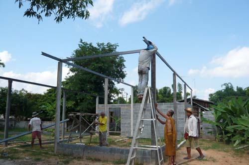 เราจะเริ่มงานด้วยการร่วมระดมทุนตามกำลังศรัทธา เพื่อซื้อวัสดุก่อสร้าง เช่น ปูนซีเมนต์ ทราย อิฐ หิน เหล็ก เสา กระเบื้องหลังคา ไม้ ไม้เชอร่า ฯลฯ แรงงานช่างจะเรียกอาสาสมัครจากชาวบ้าน ความสมบูรณ์ของอาคารขึ้นอยู่กับจำนวนทรัพย์ที่ร่มบริจาคเข้ามา งานก่อสร้างจะเริ่มต้นเดือนมีนาคม พ.ศ. 2552 และเสร็จก่อนสงกรานต์ปีนี้