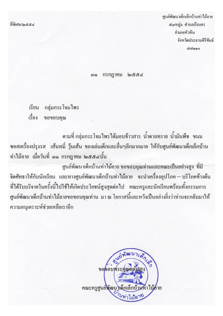 30/7/2554 ได้ร่วมเดินทางกับกลุ่มคุณชนินทร์และเพื่อนกลุ่มpajero เข้าไปทำกิจกรรมที่ศูนย์เด็กเล็กท่าไม้ลายต.บึงนคร อ.หัวหิน จ.ประจวบคีรีขันข์ ออกเดินทางจากกรุงเทพฯตอนเช้าวันที่30/7 ท่ามกลางสายฝนโปรยปรายตลอดทางเพื่อไปจุดนัดพบที่ร้านเพชรเพิ่มพร แยกวังมะนาว