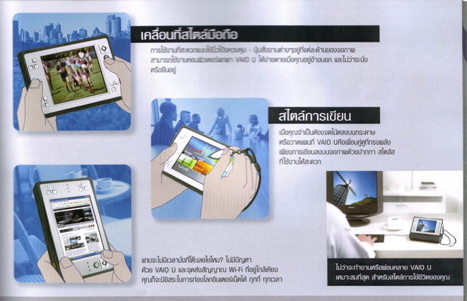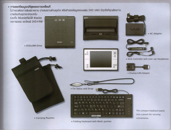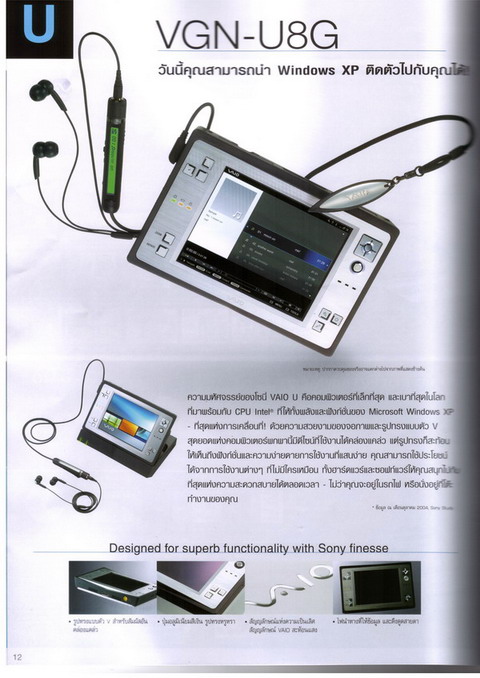vaio ตัวนี้เป็นใช้ OS win xp บนtablet ตัวที่เล็กที่สุดแล้วครับ ราคา 55900 ผมดูที่พันธ์ทิพย์กำลังออกบูธอยู่ แต่ที่ไม่รู้คือว่า cpu เท่าไร เพิ่มแรมได้ไหม HDDเท่าไร ราคาพอๆกับ laptop รุ่นกลางๆถึงสูง touchscreen จอละเอียดแสดงผลดีมากครับ ละเอียดที่สุดเท่าที่เคยเห็น สวยครับ แต่ผมว่าคงเบื่อง่ายซื้อ psp เล่นดีกว่าแล้วเอา notebook รุ่นธรรมดาดีก่า ได้ utility เต็มกว่าสำหรับผม