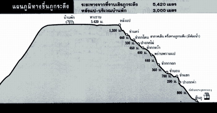 ความชันของเส้นทาง จะเริ่มชันมากขึ้น ในช่วงก่อนขึ้นซำแรก คือ ในช่วงแรก หลังจากนั้นเป็นทางราบบ้าง เป็นเนินบ้าง ในช่วงก่อนถึงพร่านพรานแป ถ้าจะเดินไปตามทางที่ตัดซิกแซก ทำให้ไม่เหนื่อยเร็ว แต่บางคน ชอบทางลัด กลับเดินขึ้นไปตามทางชัน และไปจนช่วงสุดท้าย จากซำแคร่ถึงหลังแป ดูเหมือนจะเป็นช่วงที่ชันที่สุด ในขณะที่ทุกคนเหน็ดเหนื่อย จนจะหมดแรงเดินอยู่แล้ว พลันก็โผล่พ้นหลังแป ได้แลเห็นทิวทัศน์ท้องทุ่งที่ราบกว้าง และหมู่ดงสนที่ขึ้นแซมอยู่งดงาม ความเหนื่อยยากที่อุตส่าห์ บากบั่นขึ้นมา ก็แทบหายไปจากหลังแป ยังต้องเดินต่อไปตามทางราบอีกประมาณ 3 กม. จนถึงบริเวณบ้านพัก