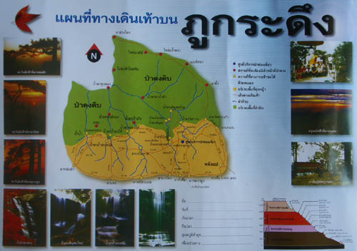 นักท่องเที่ยวทุกท่าน ควรติดต่อที่ เจ้าหน้าที่ของอุทยาน เพื่อจ่ายค่าธรรมเนียม การเข้า อุทยาน คนละ 20 บาท ซึ่งท่านจะสามารถ ขอข้อมูล ในการท่องเที่ยว บนภูกระดึง ได้จากเจ้าหน้าที่ ส่วนเรื่องอาหาร ถ้าเป็นไปได้ ไม่ควรนำขึ้นไป เพราะด้านบนภู มีบริการให้อยู่แล้ว ราคาอาหารอาจจะแพงบ้าง แต่ก็เป็นราคาที่ รวมค่าลูกหาบ ที่นำอาหารขึ้นไป เท่านั้นเอง และสำหรับท่านที่คิดว่า ร่างกายไม่พร้อม ในเรื่องแบกสัมภาระ ก็สามารถติดต่อลูกหาบ ได้โดยเสียค่าลูกหาบ กก.ละ 10 บาท หลังจากนั้น ก็เป็นการเดินทางขึ้นเขา ตามทางเดินจะมีที่พัก เป็นราวนั่ง หรือศาลา อยู่เป็นระยะ ซึ่งมีชื่อเรียกต่างกันไป บางชื่อขึ้นต้นด้วย ซำ หมายถึง บริเวณที่เป็นตาน้ำ มีนำซึมขึ้นมาจากดิน หรือมีชื่อขึ้นต้นด้วย บาง หมายถึง ที่พักระหว่างทาง เช่น ซำแฮก คือซำแรก ปางกกค่า คือต้นมะค่า ซำกกกอก คือซำต้นมะกอก เป็นต้น