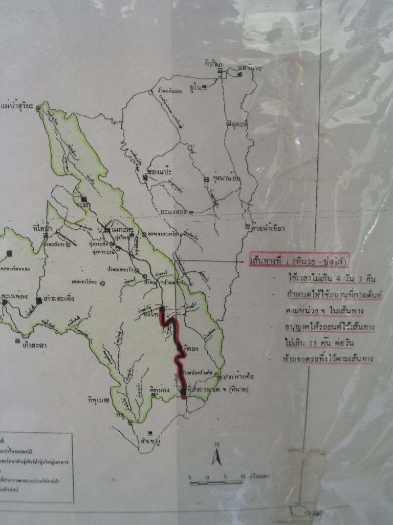 จะใช้เส้นทาง 323 เข้านิคมสหกรณ์-เหมืองสองท่อ-ห้วยเสือ จากบริเวณแยกห้วยเสือ ไปยังบ้านคลีตี้ ระยะทาง 42 กม. ต่อจากนั้นมีทางแยกไปที่การเขตฯ จนถึงห้วยซ่งไท้อีก 40 ก.ม.