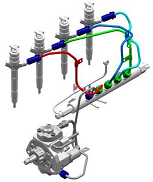 เนื่องจากต้องฉีดน้อยๆหลายครั้ง รูหัวฉีดต้องเล็กและมีหลายรูเพื่อกระจายพื้นที่ของเปลวไฟให้ทั่วหัวลุกสูบสูบทำให้ต้องใช้ปั้มแรงดันสูงเป็นตัวจ่ายน้ำมัน บางรุ่นเช่น 4M41 ในไตตัน ฉีดน้ำมันทะลุมือได้เลยถ้าทะลึ่งเอามือไปบังหัวฉีดขนาด 180MPa