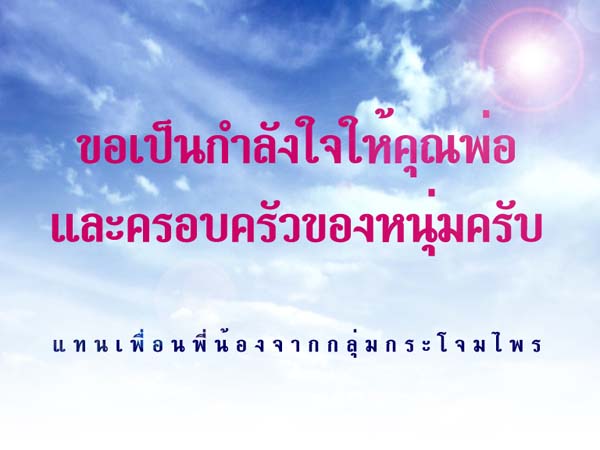 ได้ทราบว่า ขณะนี้คุณพ่อของคุณหนุ่ม กำลังป่วยหนัก อยู่ในห้องฉุกเฉิน ผมขออนุญาติเป็นตัวแทน กลุ่ม Explorer ขอส่งกำลังใจถึง คุณหนุ่ม ขอให้อำนาจคุณพระศรีรัตนตรัย ช่วยให้คุณพ่อ กลับมาสุขภาพที่แข็งแรงเช่นเดิมด้วยครับ