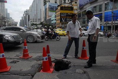 fiogf49gjkf0d เตือนมีหลุมกว้าง1ม.แยกอโศกฯ-ปิดการจราจร