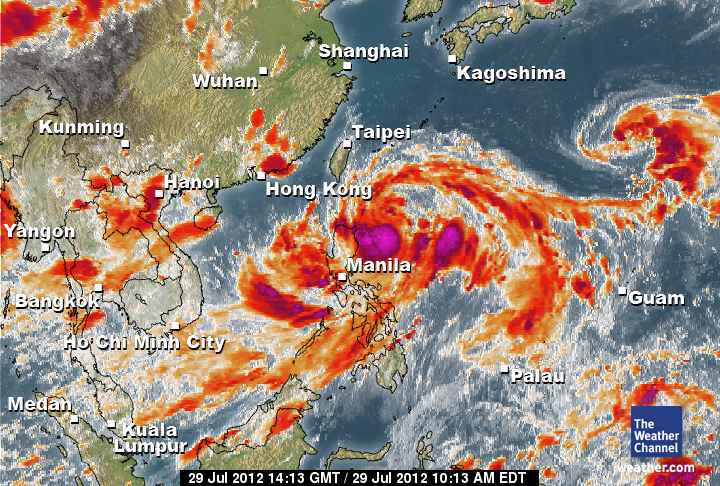 fiogf49gjkf0d มาอีกแล้ว ตามที่คาดหมายไว้ 2 ลูก ใช้ระยะเวลาในการพัฒนาจากดีเปรชชั่น เป็นพายุโซนร้อน 4 วัน ขณะนี้อยู่ทางตอนเหนือของเกาะฟิลิปปินซ์ เป้าหมายฮ่องกง กับไทเป งานนี้จัดเต็ม สำหรับลูกนี้ชื่อ "ซาวลา" ส่วนอีกลูกตามติดๆ ห่างจากลูกแรก 2 วันจะขึ้นฝัง ชื่อ "ดอมเรย์" ซึ่งถ้าลูกแรกอ่อนกำลังลงใน 2-3 วันข้างหน้า จะทำให้ลูกที่ 2 ตามทัน และมีโอกาสผสมรวมกัน ซึ่งในกรณีนี้จะสร้างความเสียหายกับ ไทเป กับฮ่องกง มากมาย ขออย่างเดียวอย่างหันมาทางไทย เป็นพอ เพราะแค่นี้ก็ทำให้ประเทศไทยมีฝนตกชุกบริเวณภาคเหนือ ภาคตะวันออก ภาคอีสาน แลุะภาคกลาง (กรุงเทพฯ) ไปไหนมาไหนติดร่มไปด้วยน่ะครับ