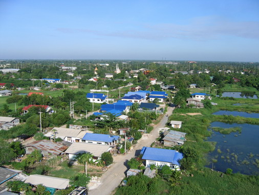 เห็นหลังคายาวๆเป็นแผงเรียงรายอยู่นั้น คือ โรงเลี้ยงไก่ของชาวบ้านย่านบางปะกง พวกเราจะไม่บินเข้าใกล้ครับ เสียงเครื่องยนต์พารามอเตอร์ใบพัด อาจทำให้ไก่ทั้งเล้างดออกไข่ได้ ครับ