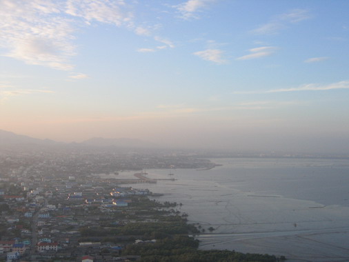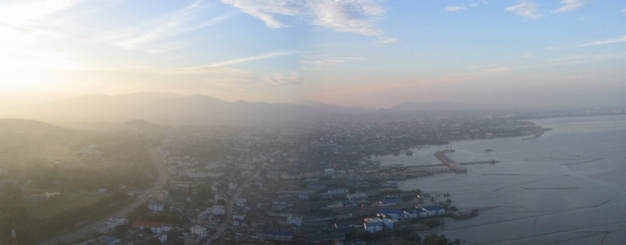 ภาพพาโนราม่า ภูเขาอันเป็นที่ตั้งของค่ายนวมินทราชินี เมืองชลบุรี และ ทะเล
